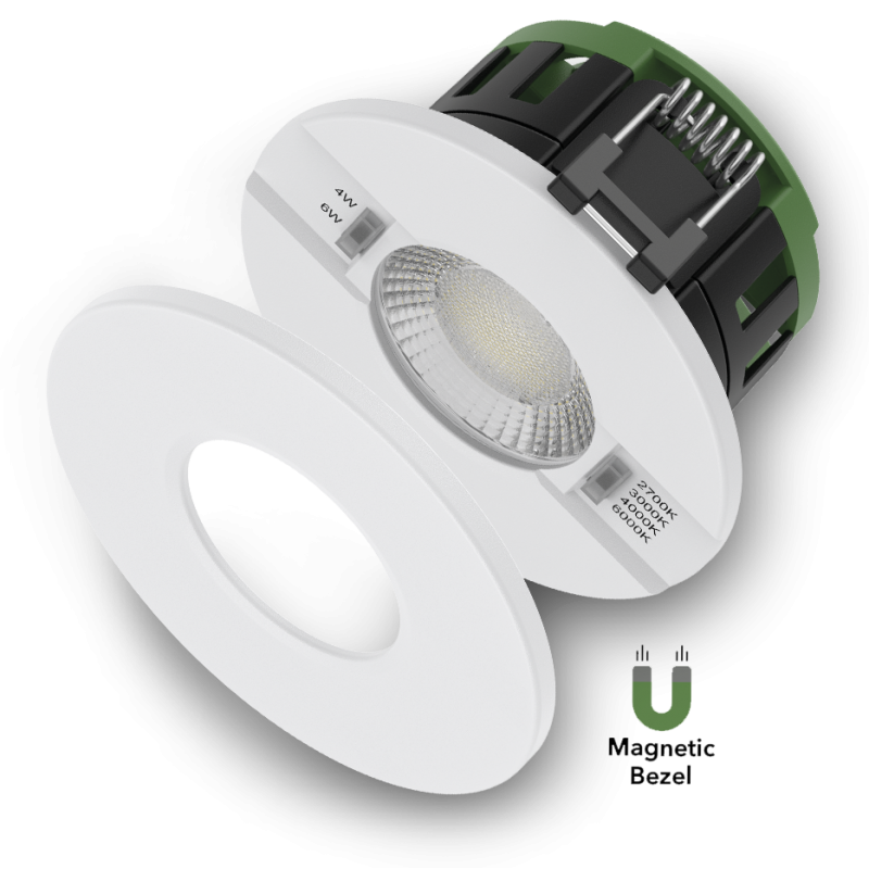 Easily accessible switch for wattage and colour temperature, Magnetic replaceable bezel, Male & female quick plug connection with lever terminals makes fast installation and testing.